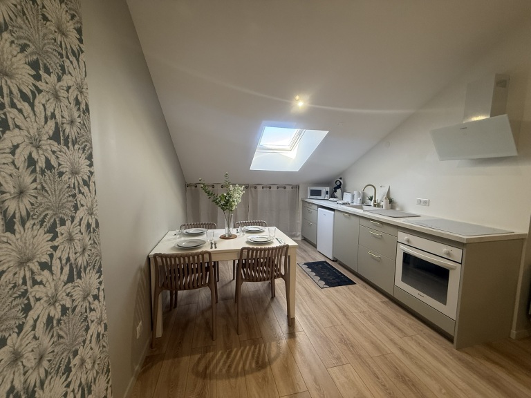 Situé au dernier étage, cet appartement sous les toits a été entièrement rénové avec goût et souci du détail, offrant un véritable havre de paix en plein cœur de la ville. Sa décoration soignée mêle harmonieusement modernité et charme traditionnel, créant une ambiance chaleureuse et accueillante. Les grandes fenêtres de type Velux inondent l’espace de lumière naturelle tout au long de la journée, créant une atmosphère lumineuse et aérée qui invite à la détente. Conçu pour maximiser l’espace, cet appartement cosy dispose d’un salon confortable où vous pourrez vous détendre après une journée bien remplie, d’une cuisine équipée moderne et fonctionnelle, idéale pour préparer vos repas avec plaisir, ainsi que d’une chambre douillette offrant un sommeil réparateur. La décoration raffinée, mêlant touches vintage et éléments contemporains, confère à l’ensemble un style unique, alliant authenticité et élégance citadine. La disposition intelligente de l’appartement garantit une intimité totale, parfait pour un séjour romantique en couple ou pour un week-end entre amis à la recherche de confort et de convivialité. Sa localisation privilégiée dans le centre-ville vous permet d’accéder facilement aux principales attractions, restaurants, boutiques et sites culturels, tout en bénéficiant d’un environnement calme et paisible. Que vous soyez en déplacement professionnel ou en escapade touristique, cet appartement incarne l’équilibre idéal entre le charme authentique d’un quartier vibrant et le confort moderne indispensable à un séjour réussi. En somme, il représente une option idéale pour ceux qui recherchent un pied-à-terre élégant, pratique et chaleureux, pour profiter pleinement de tout ce que la ville a à offrir tout en se sentant comme chez soi.